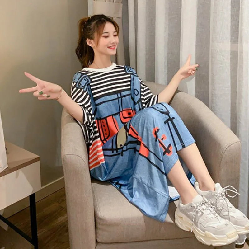 Fashion Printed Striped Fake Two Pieces Casual Dresses Female Clothing 2024 Summer New Loose Korean Batwing Sleeve Midi Dress